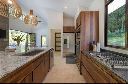 Inside, the open-concept design creates a bright and welcoming atmosphere. The custom-built wood cabinetry, quartz countertops, and abundant storage space make the kitchen both beautiful and functional. Large sliding glass doors allow you to enjoy stunning garden and pool views from every room, while tall ceilings, ceiling fans, and air conditioning ensure maximum comfort year-round.