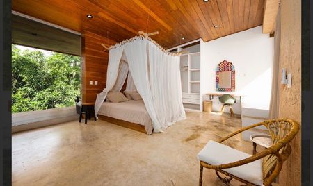 Inside, the home blends natural materials with clean, modern design. Locally sourced wood, open-air architecture, and contemporary finishes create an elegant yet grounded atmosphere. Each bedroom offers privacy and comfort, with large windows framing views of the ocean and the surrounding jungle canopy.