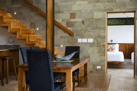 Ascend the floating staircase to discover a mirrored upper-level suite with its own patio, offering unparalleled views of Costa Rica's wildlife. An adjacent office nook and a versatile "toucan deck" provide additional spaces for relaxation or transformation into a third suite.